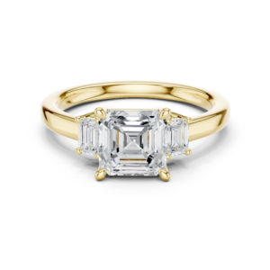A sophisticated three-stone diamond ring featuring a striking Asscher-cut center diamond, flanked by sleek baguette side stones. The clean geometry and balanced proportions create a modern yet timeless design, perfect for everyday elegance or special occasions.