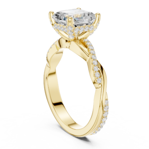 A striking Asscher-cut diamond ring featuring a bold center stone secured in a prong setting, complemented by a twisted shank adorned with shimmering round diamonds. The elegant crossover band adds a modern touch to this timeless design, making it a standout piece for any occasion.