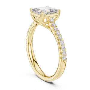 A sophisticated solitaire diamond ring featuring a bold Asscher-cut center stone, known for its step-cut facets and vintage-inspired elegance. The band is adorned with fine round diamonds, adding a refined sparkle that complements the geometric brilliance of the center stone.