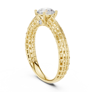 A distinctive diamond ring featuring a brilliant round-cut center stone elevated above a detailed lattice-pattern band. Accented with smaller diamonds beneath the setting, this design blends structure and elegance for a bold modern look.