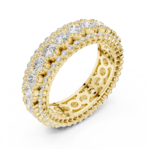 A bold triple-row eternity band featuring large round diamonds at the center flanked by rows of smaller diamonds. Designed for maximum brilliance and presence, this piece delivers a rich, luxurious look with continuous sparkle from every angle.