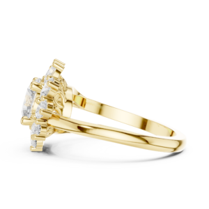 A graceful pear-shaped diamond ring surrounded by a delicate halo of round diamonds. The elevated basket setting enhances light reflection, while the slim band keeps the design refined and timeless.