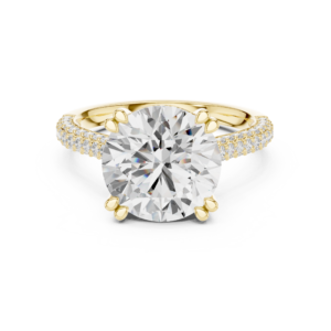 A graceful three-stone diamond ring featuring a prominent round center diamond complemented by smaller side stones. Enhanced with delicate micro-set accents beneath the center, this design offers a refined blend of brilliance and elegance.