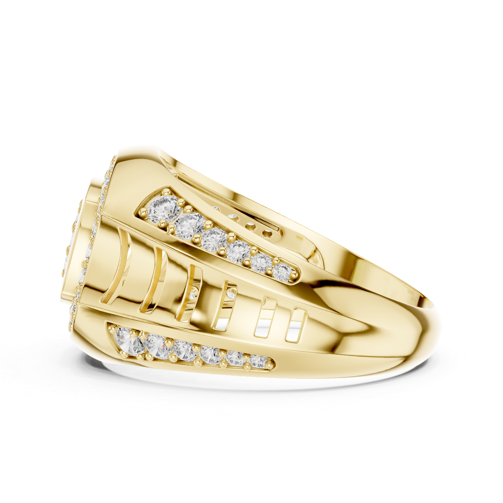 A bold statement ring featuring a striking initial-inspired center design, fully enhanced with pavé-set diamonds. The structured band and layered detailing give this piece a strong masculine presence, making it perfect for standout everyday wear or special occasions.