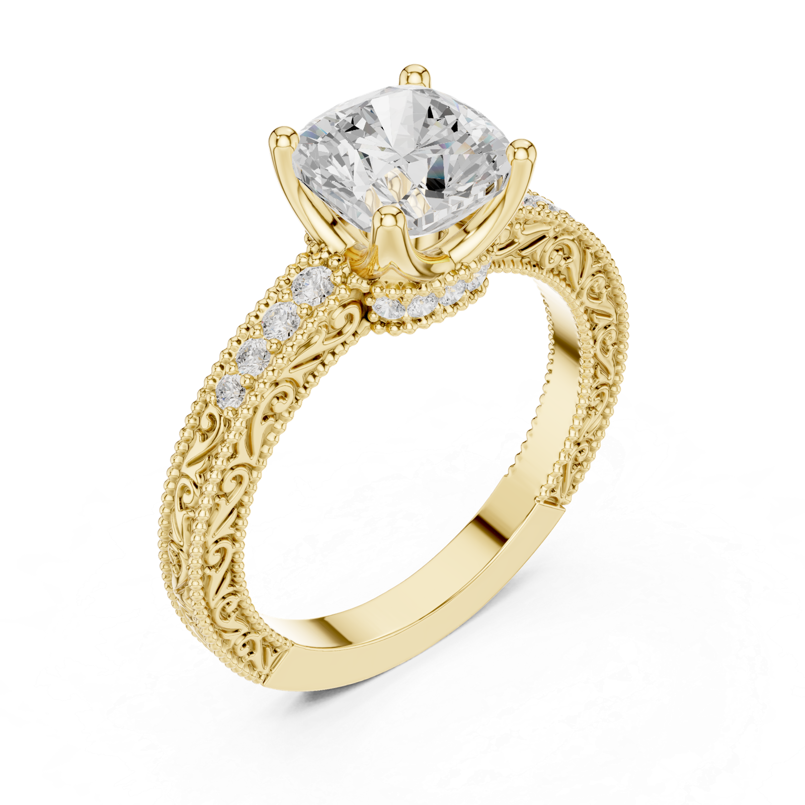 A bold and elegant diamond ring featuring a cushion-cut center stone secured in a refined prong setting. The band is lined with shimmering round accent diamonds, creating a balanced design that enhances brilliance from every angle.