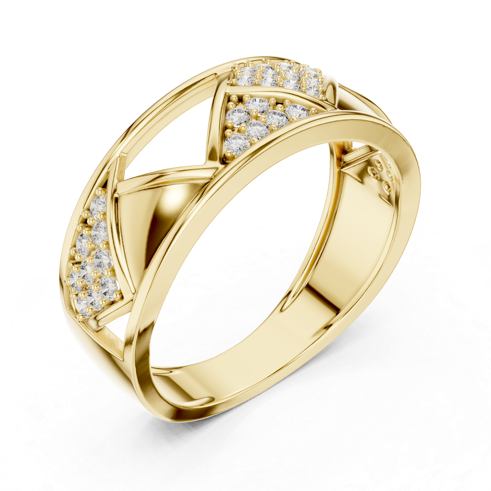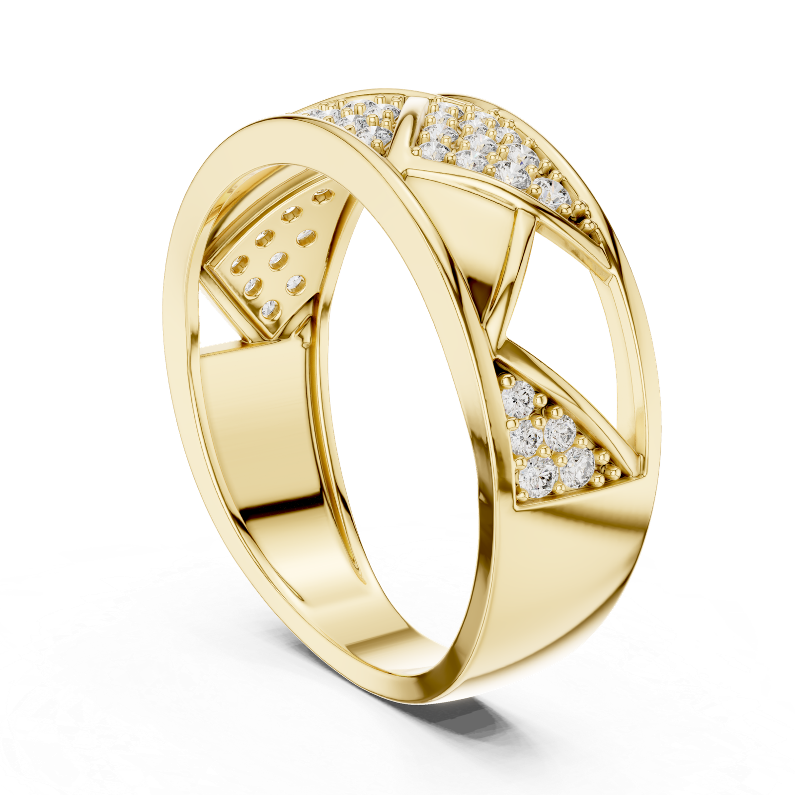 A modern diamond band featuring a distinctive cross-over design with diagonally set pavé diamonds. The layered X-pattern structure adds depth and movement, creating a bold yet refined piece suited for contemporary styling.