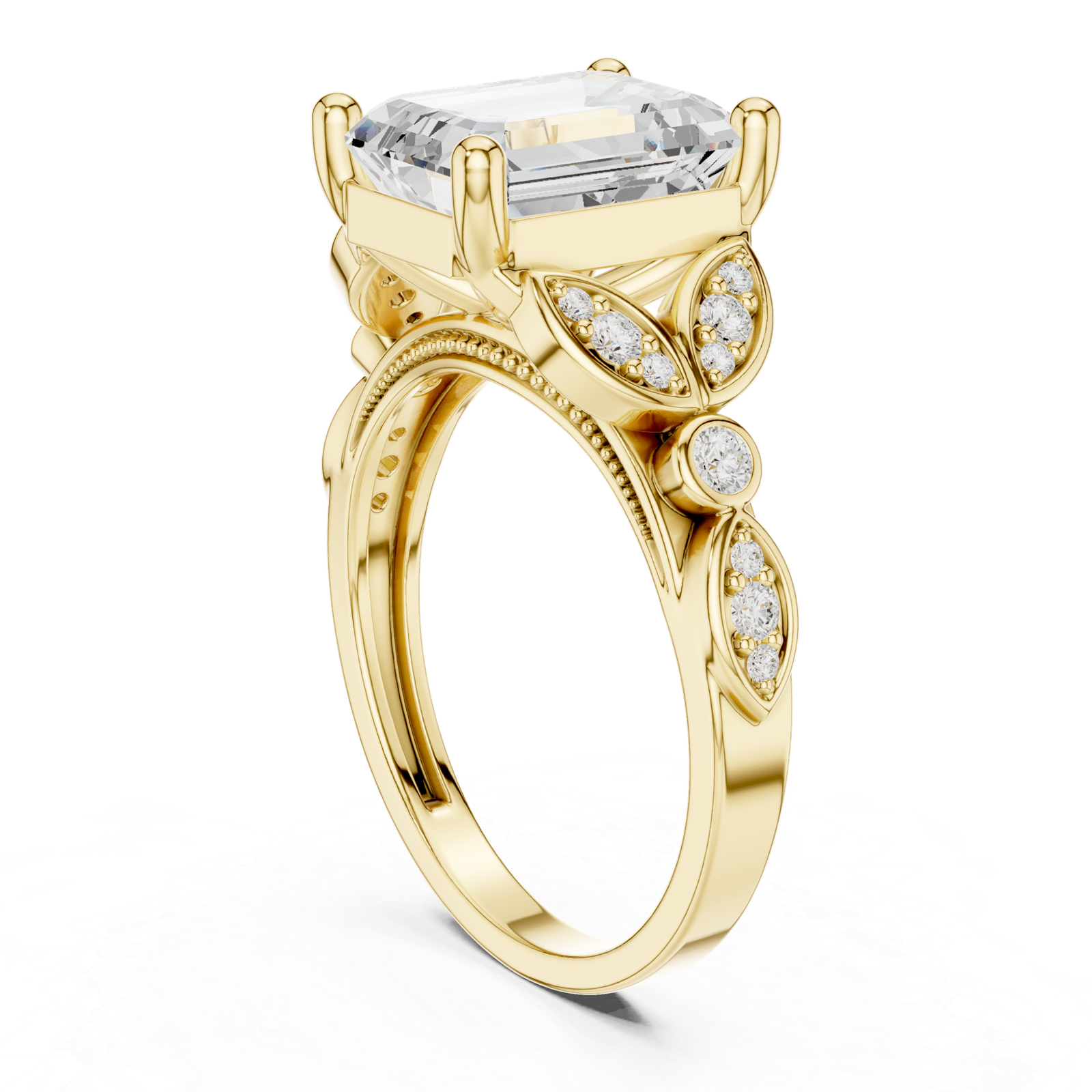 A bold statement ring featuring a striking emerald-cut center diamond complemented by round diamond accents along the shoulders. Designed with a refined elevated setting, this piece combines structured elegance with brilliant detailing for a luxurious look