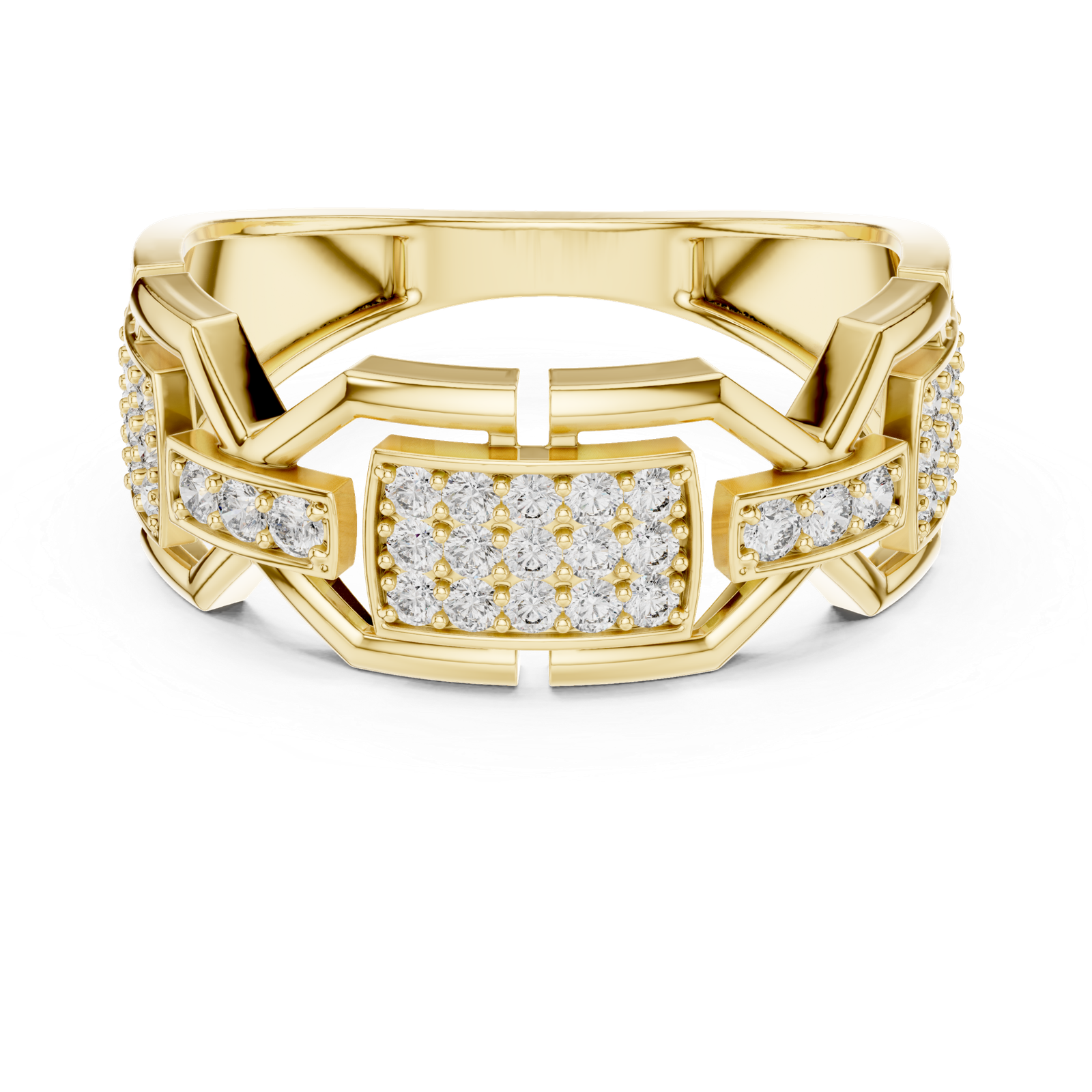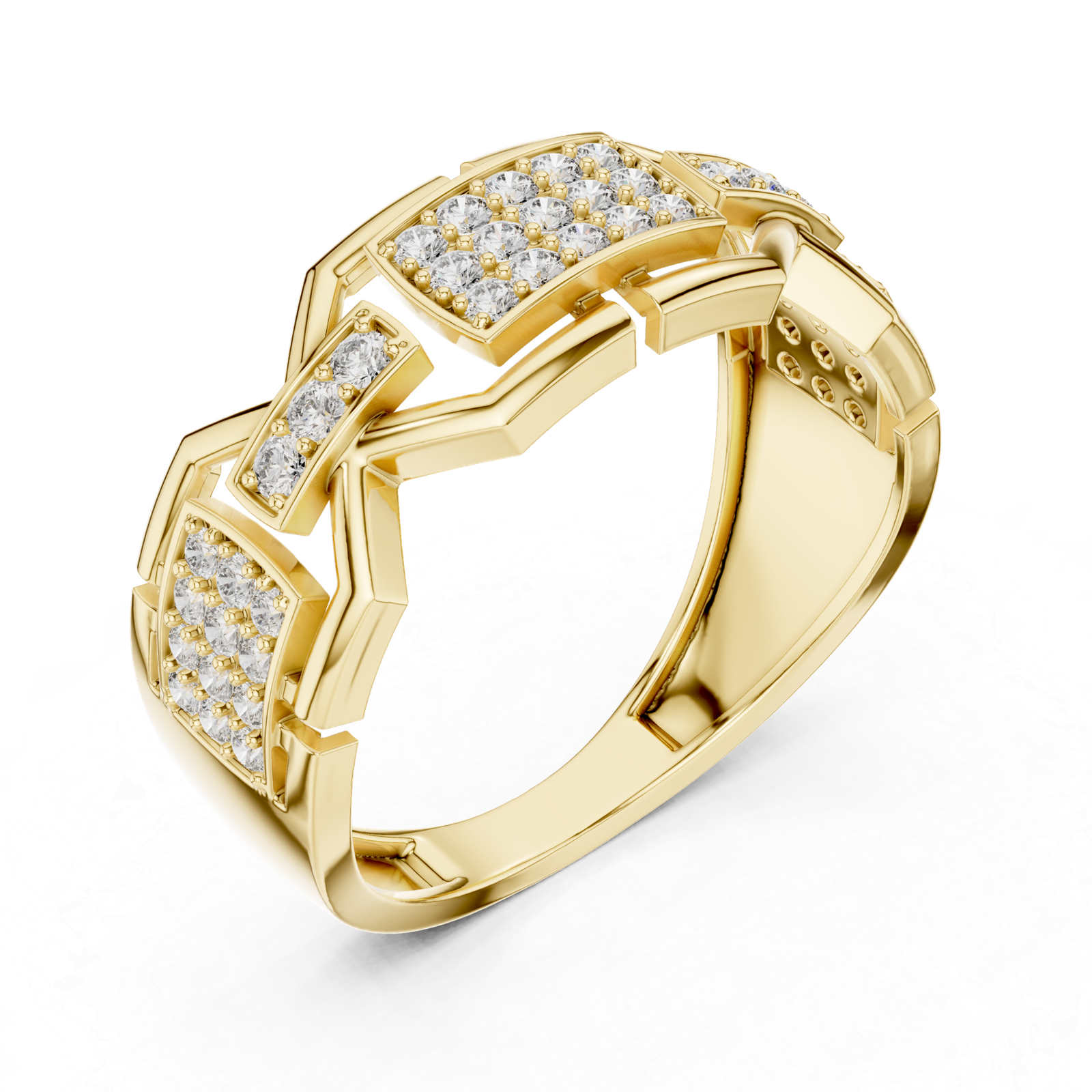 A bold geometric diamond ring featuring X-link structural detailing combined with central cluster panels of round diamonds. The symmetrical layout and pavé setting create a modern, high-impact design suited for statement styling.