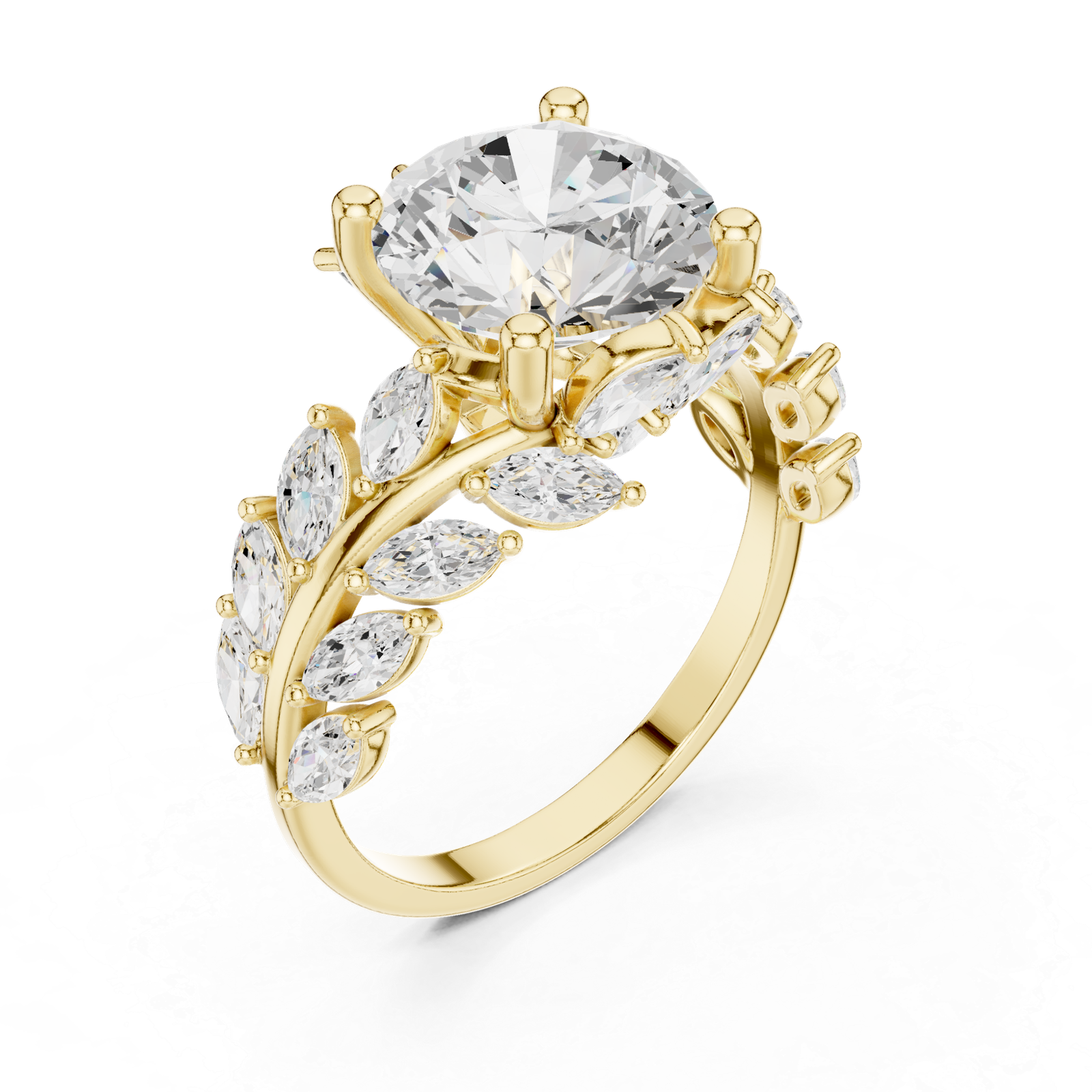 A luxurious engagement ring featuring a brilliant round-cut center diamond complemented by elegant marquise-shaped side stones. The intricate setting enhances the overall brilliance, creating a bold yet graceful statement piece.