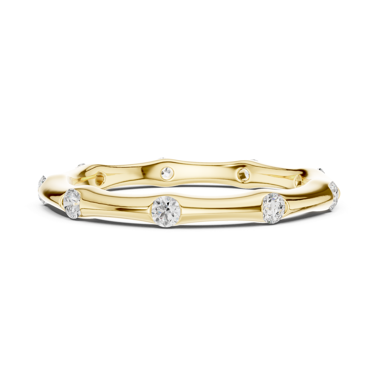 A sleek and modern diamond band featuring evenly spaced round diamonds secured in smooth bezel settings. The minimal design creates a floating stone effect, offering a refined and contemporary aesthetic perfect for everyday wear.
