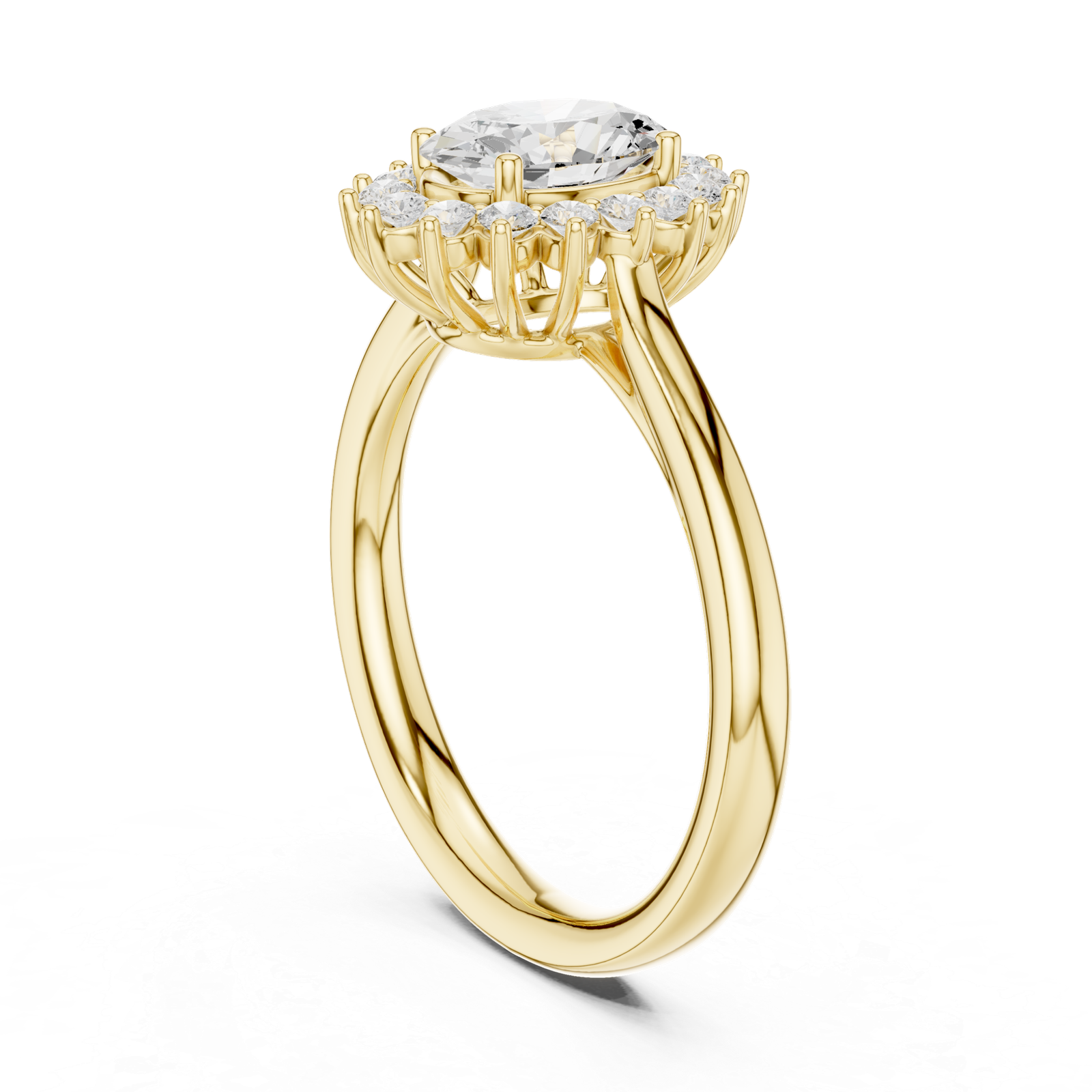 A graceful pear-shaped diamond ring surrounded by a delicate halo of round diamonds. The elevated basket setting enhances light reflection, while the slim band keeps the design refined and timeless.