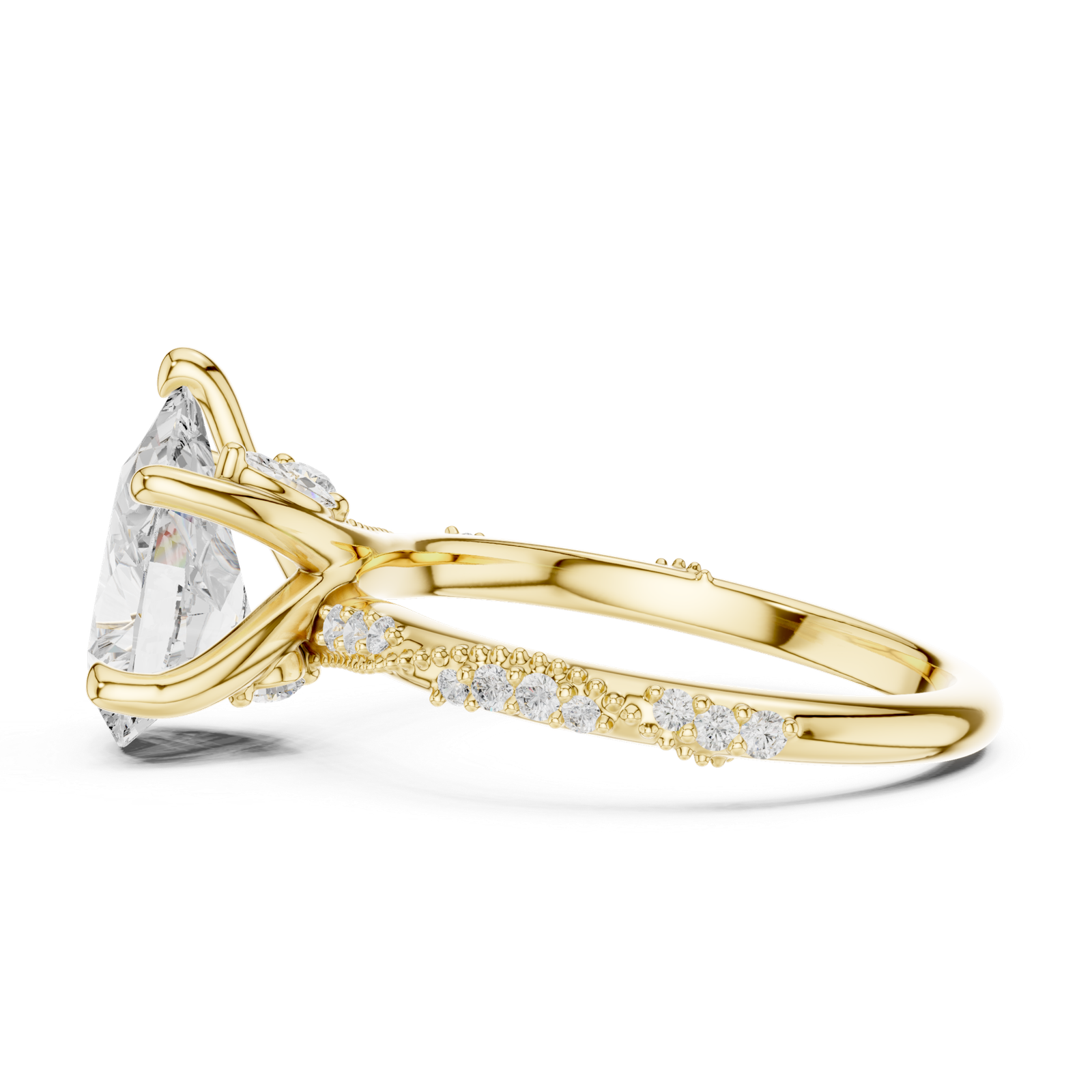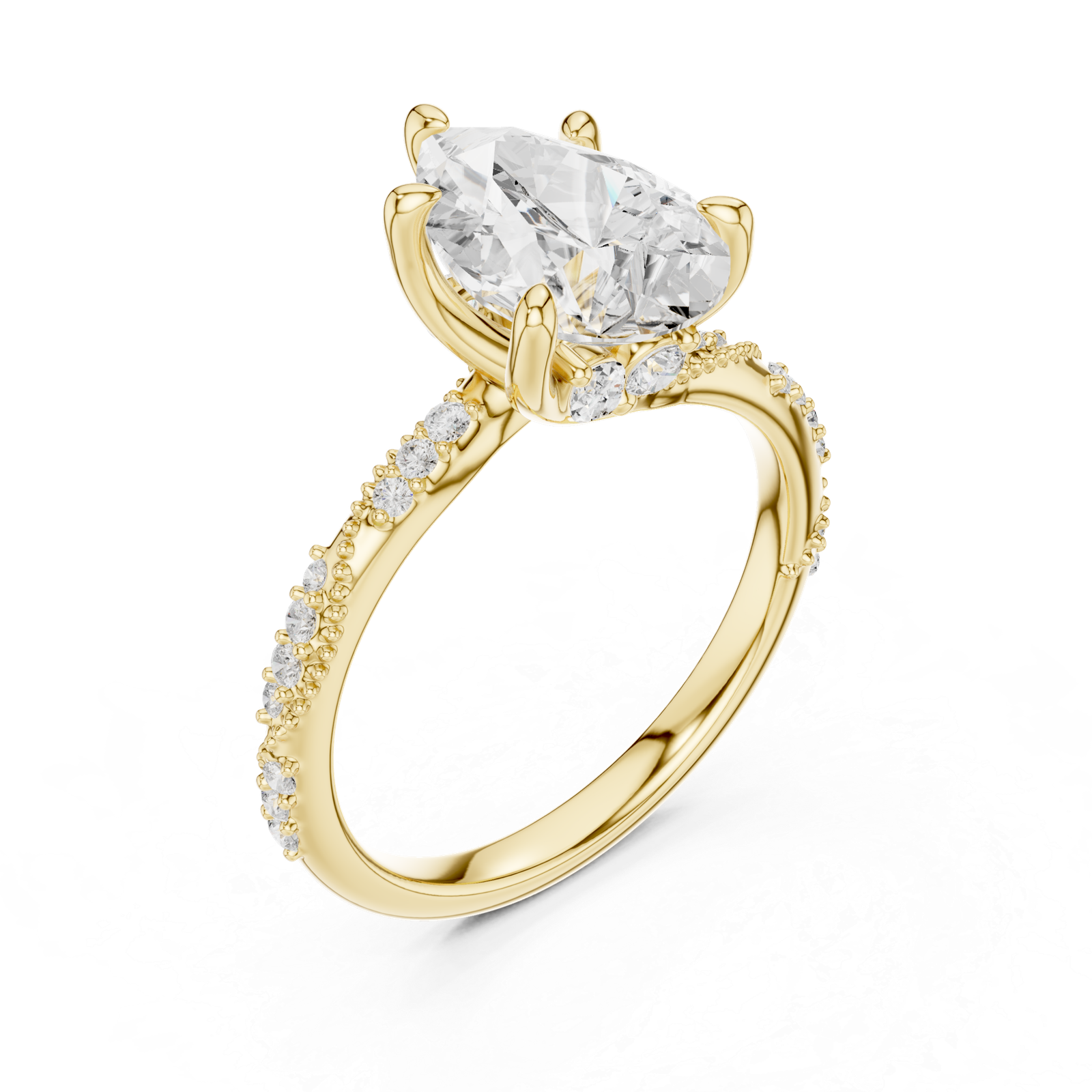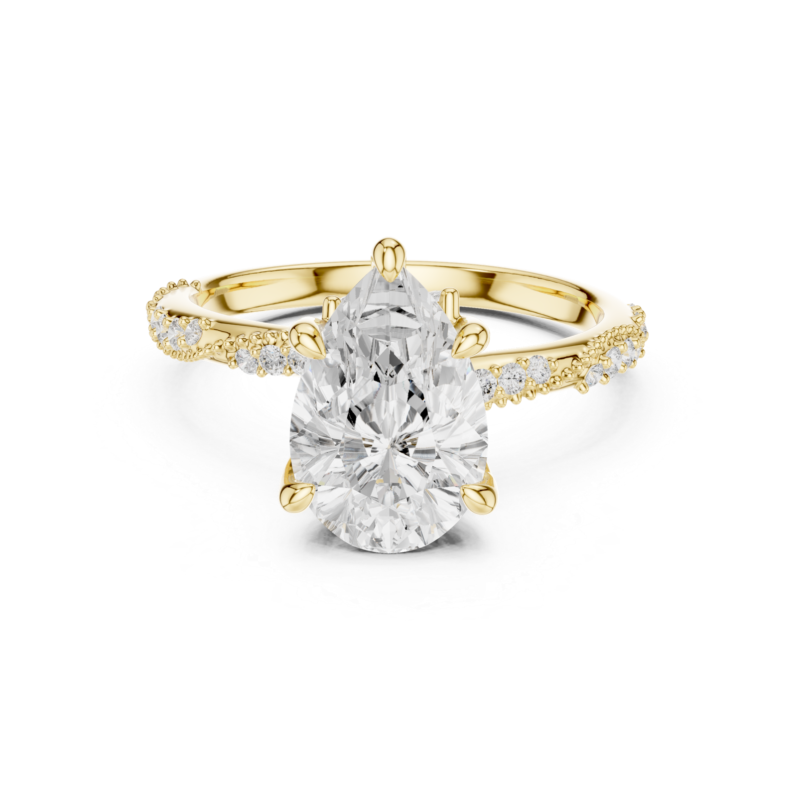 A graceful pear-cut diamond ring designed to highlight an elegant teardrop center stone. Marquise and round pavé diamonds along the band add extra brilliance, creating a sophisticated statement piece with modern craftsmanship and timeless appeal.