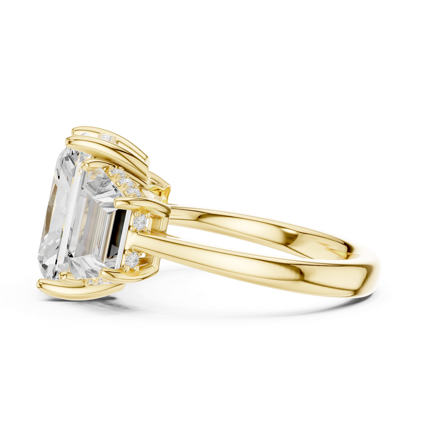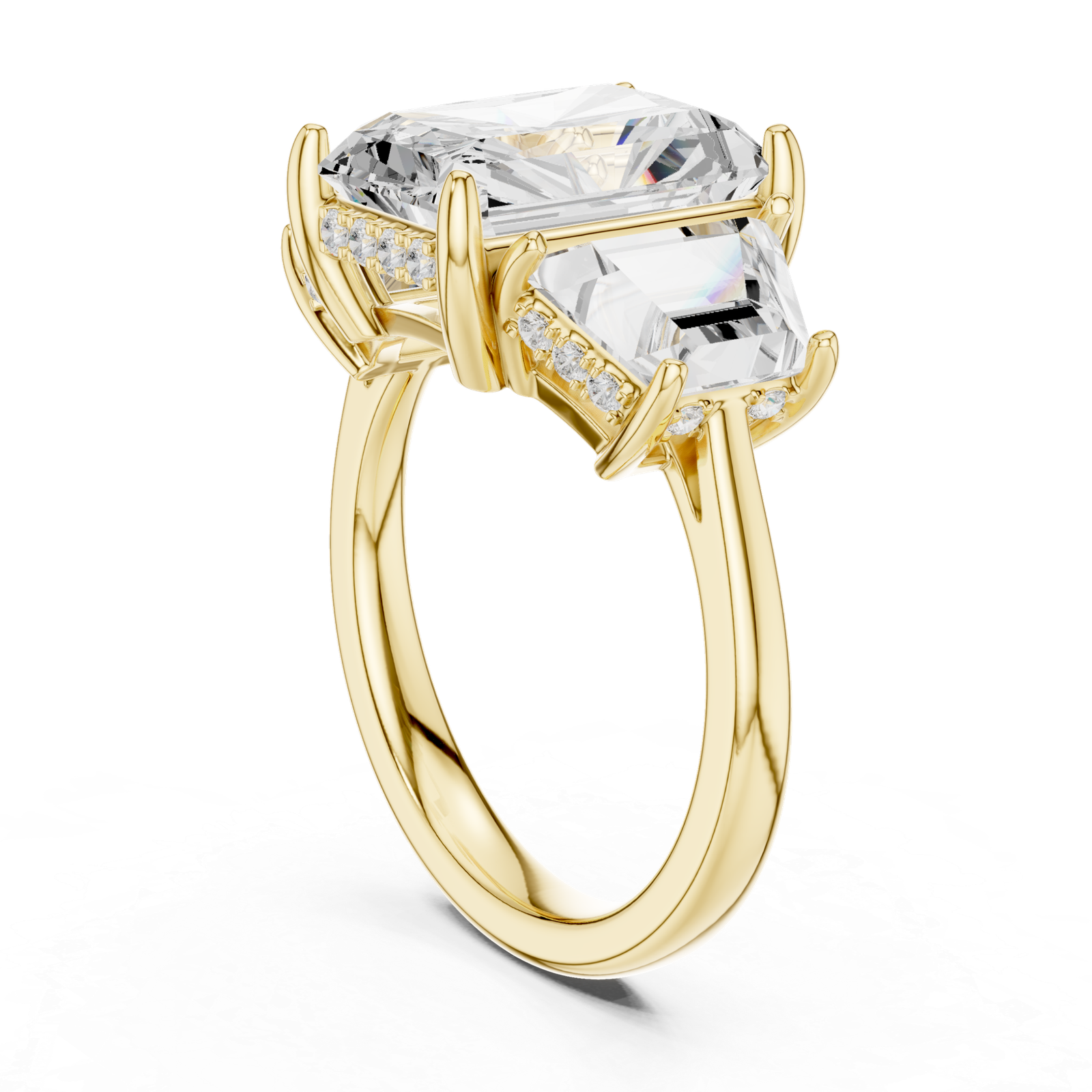 A luxurious three-stone diamond ring featuring a radiant-cut center stone flanked by trapezoid side diamonds. The band is enhanced with micro-set round diamonds, creating a bold and elegant design that symbolizes brilliance, balance, and timeless sophistication.