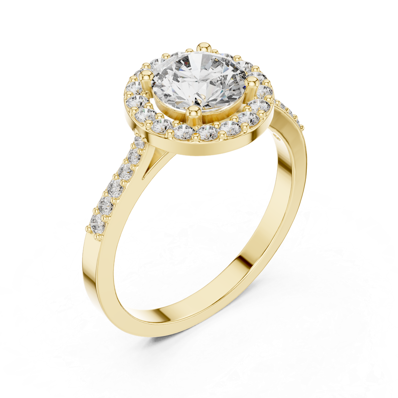 A stunning halo diamond ring featuring a brilliant round center stone surrounded by a sparkling halo of smaller diamonds. The band is accented with additional diamonds, enhancing the overall brilliance and creating a luxurious, eye-catching design.