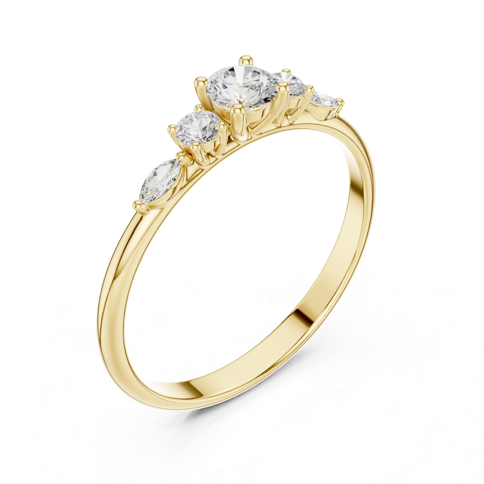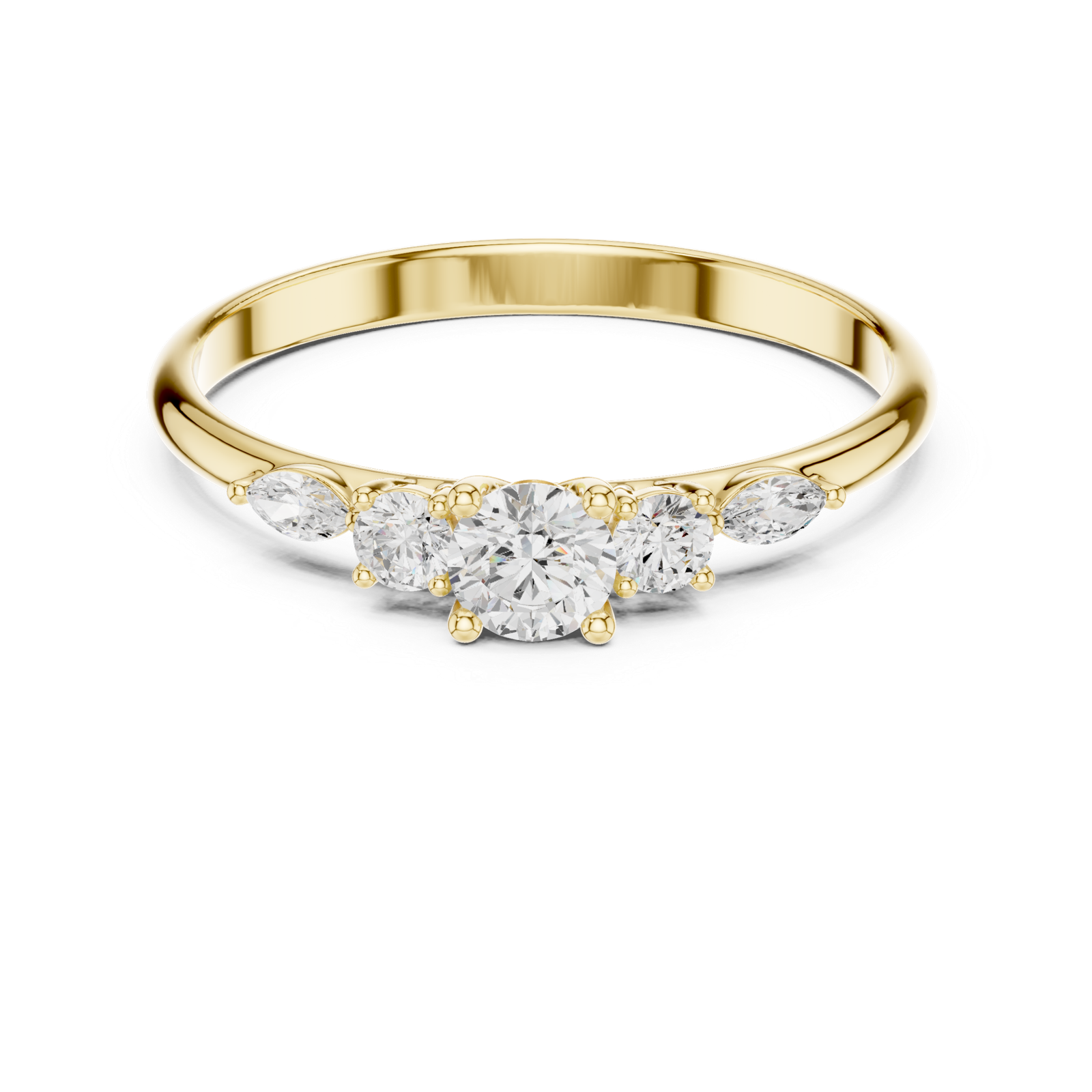 A graceful three-stone diamond ring featuring a brilliant round center flanked by marquise and round side stones. The elegant arrangement creates a balanced and sophisticated silhouette, perfect for everyday luxury with a distinctive touch.